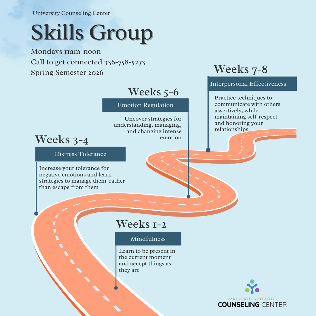 A skills group oriented towards improving members’ interpersonal skills for students who can benefit from learning more about themselves and others. Group members will practice effective ways of building relationships with others.