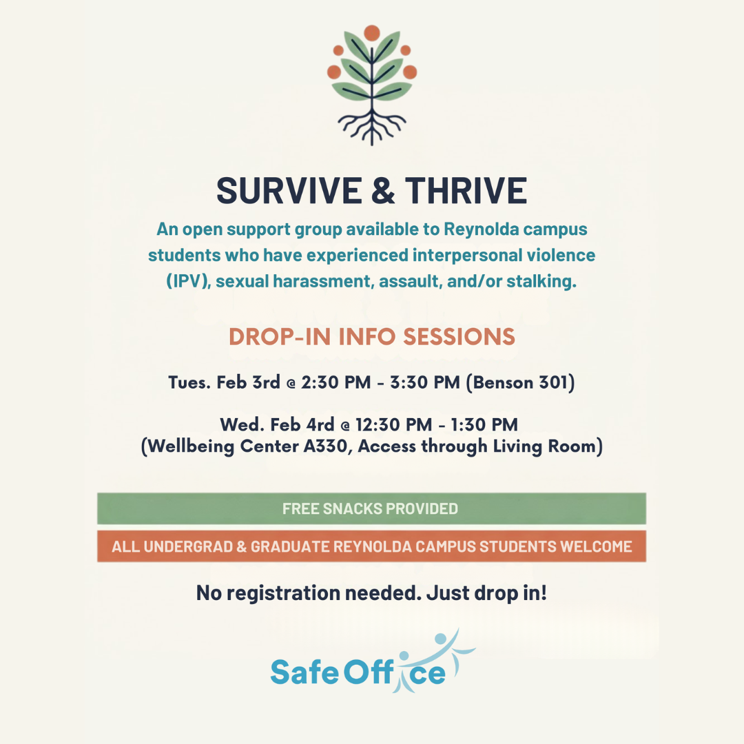 An open support group available to Reynolda campus students who have experienced interpersonal violence (IPV), sexual harassment, assault, and/or stalking.