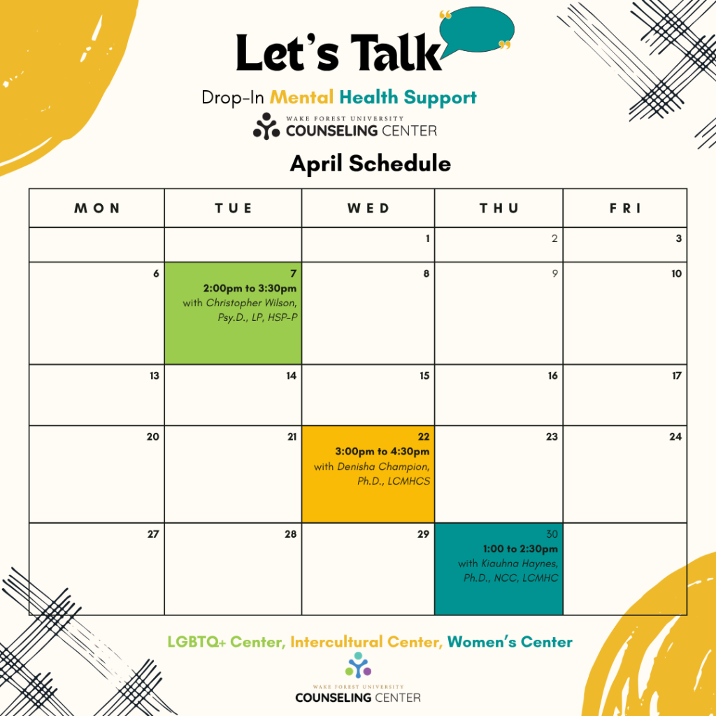 The Wake Forest University Counseling Center is deeply indebted to the clinicians at the Counseling and Psychological Services (CAPS) at Cornell University who pioneered and modeled “Let’s Talk,” made it such a successful service at Cornell, and shared program materials for integration at other institutions. The WFUCC’s Let’s Talk and the content of this webpage has been adapted from Cornell’s Let’s Talk website and materials.